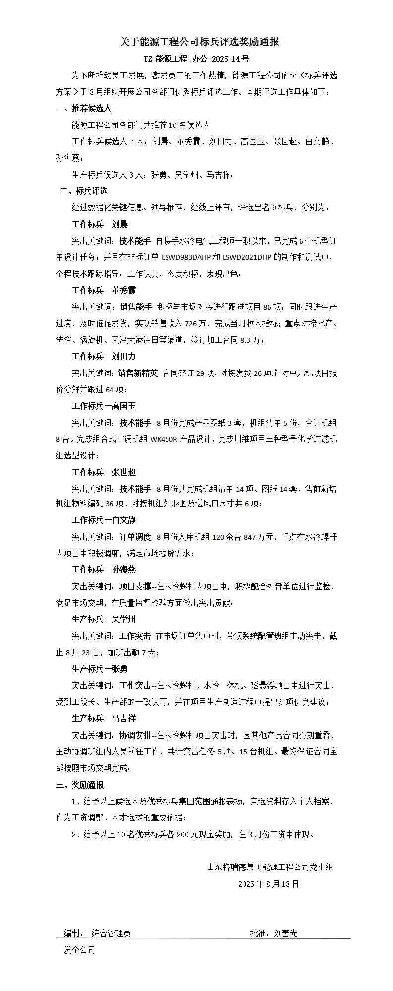 能源工程公司2025年8月份标兵通报