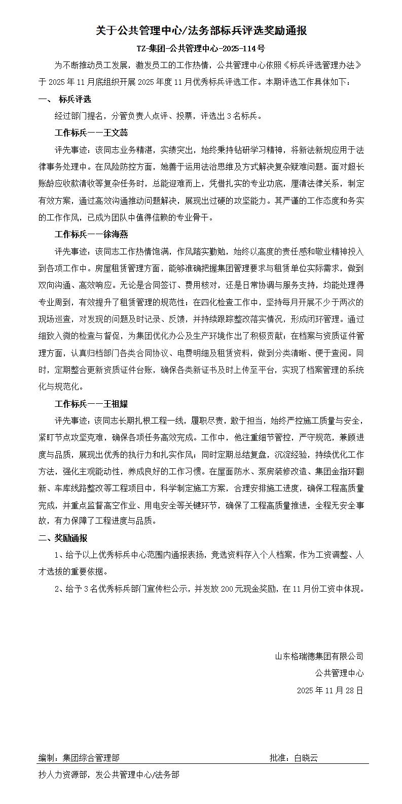 关于公共管理中心/法务部标兵评选奖励通报