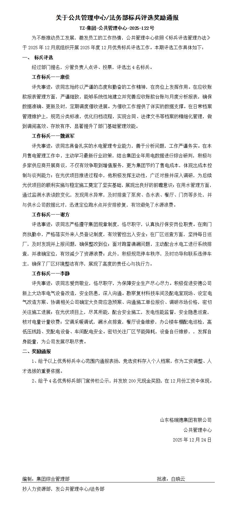 关于公共管理中心/法务部标兵评选奖励通报