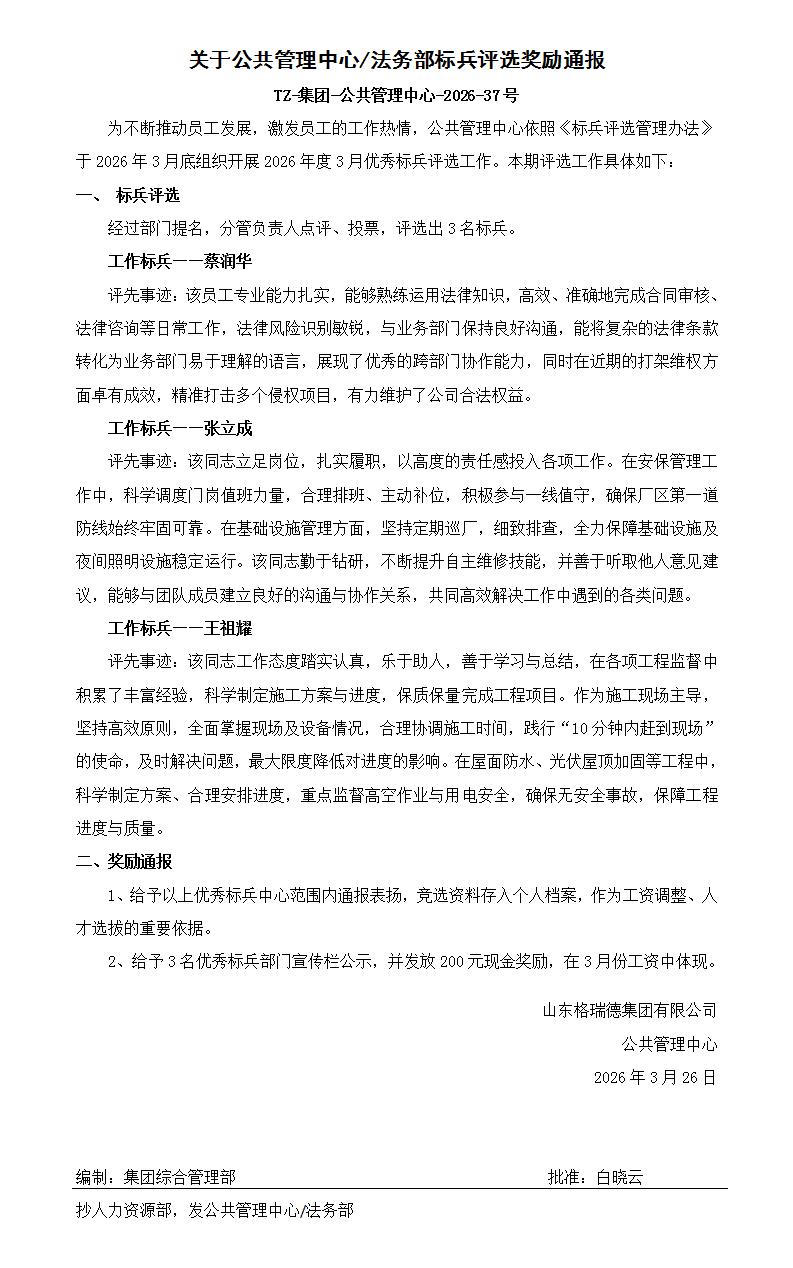关于公共管理中心/法务部标兵评选奖励通报